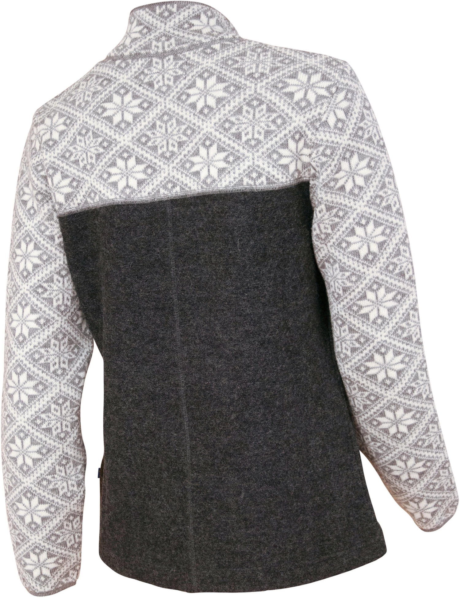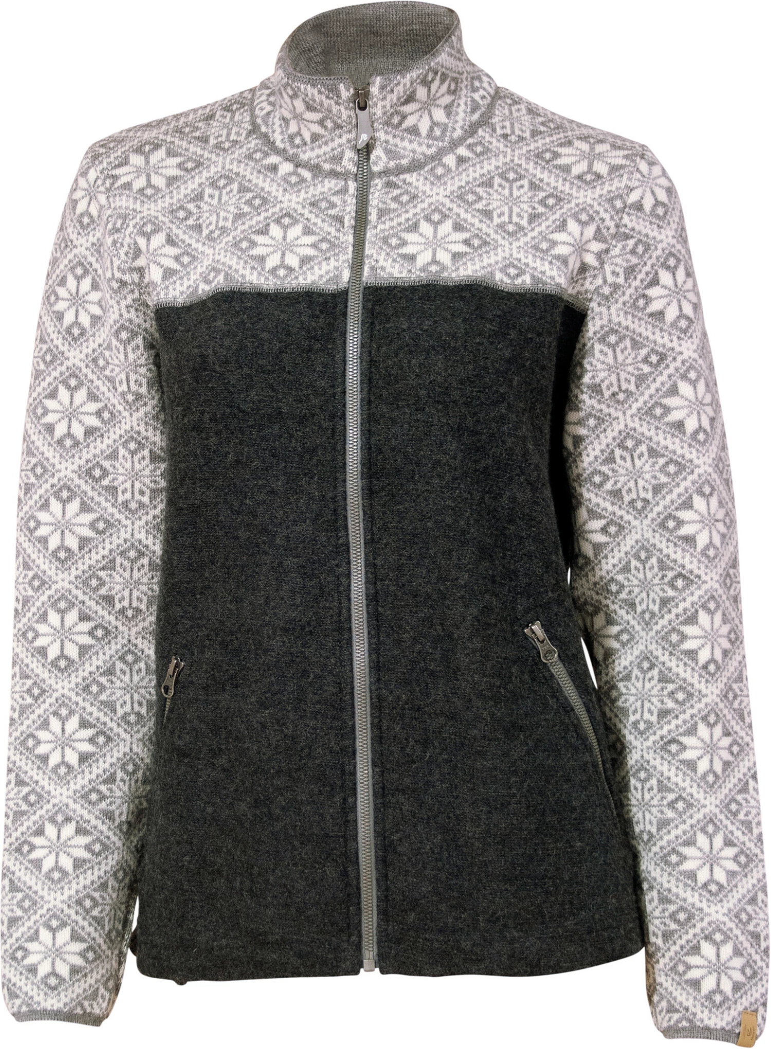 Jolie veste en laine avec un beau motif de tricot jaquard et une touche typiquement scandinave. Fermeture éclair façonnée à l’avant et poches latérales et petit badge logo en bas du bras gauche.